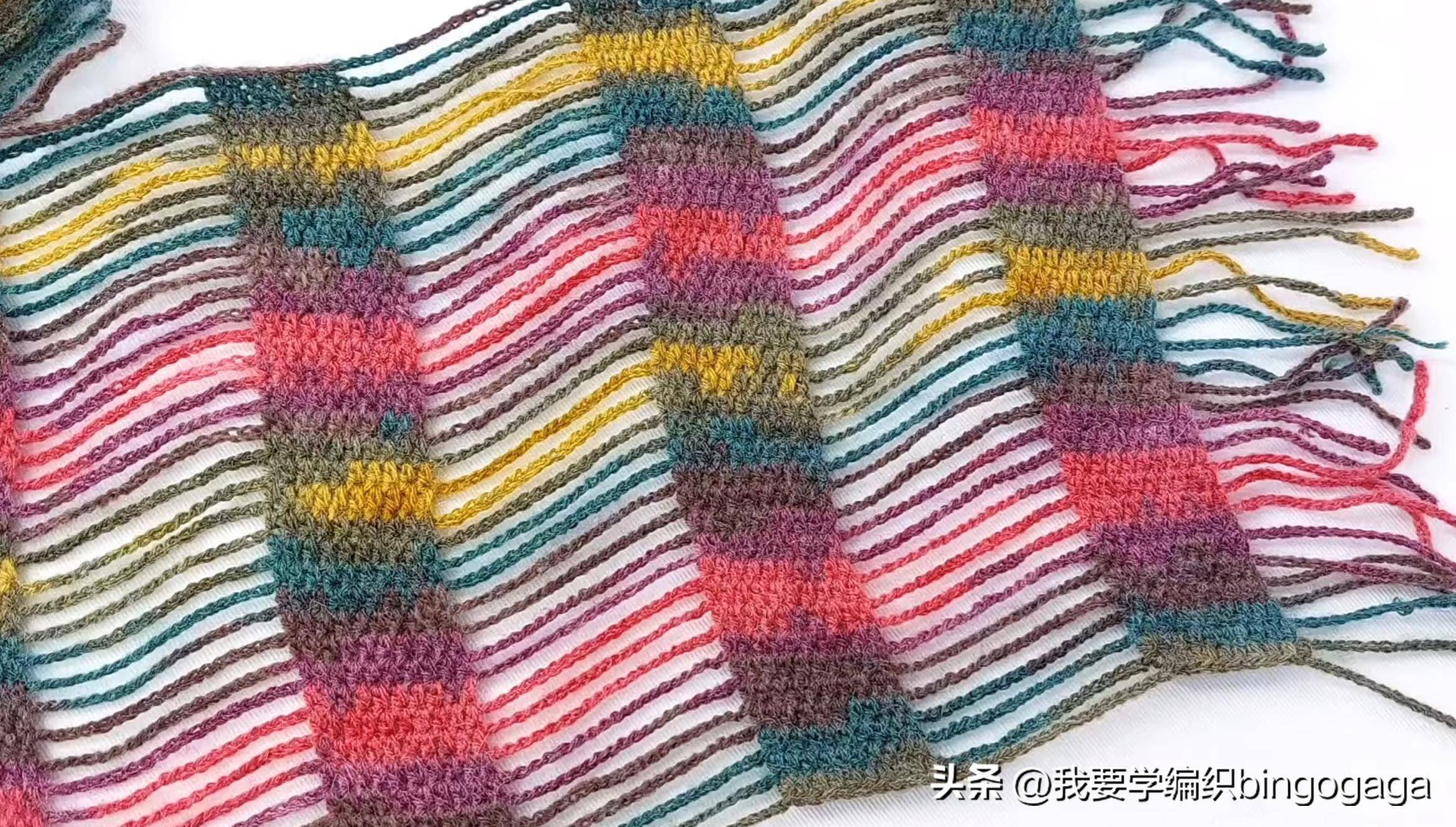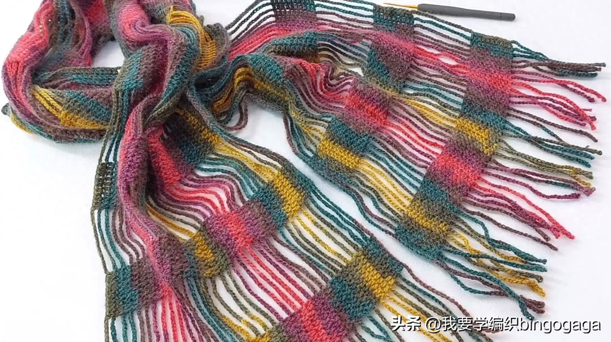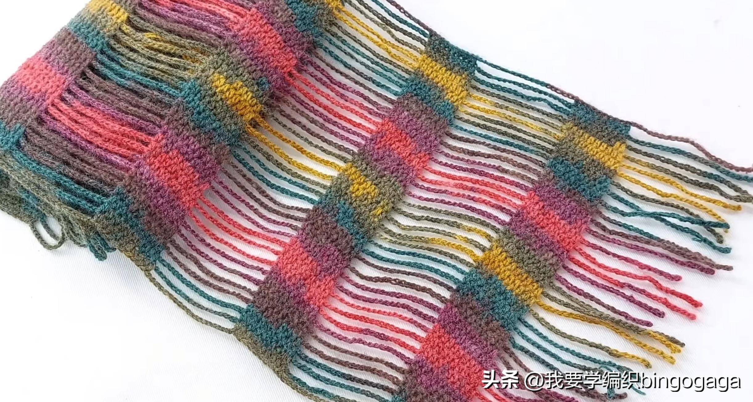 接着再另起线,按刚才那条通常的设施去钩(即锁针条对应锁针条,中长针上也曾钩中长针);背面就按照这么的设施,一直钩到思要的宽度,这么一款别出机杼的彩帘领巾就完成了。