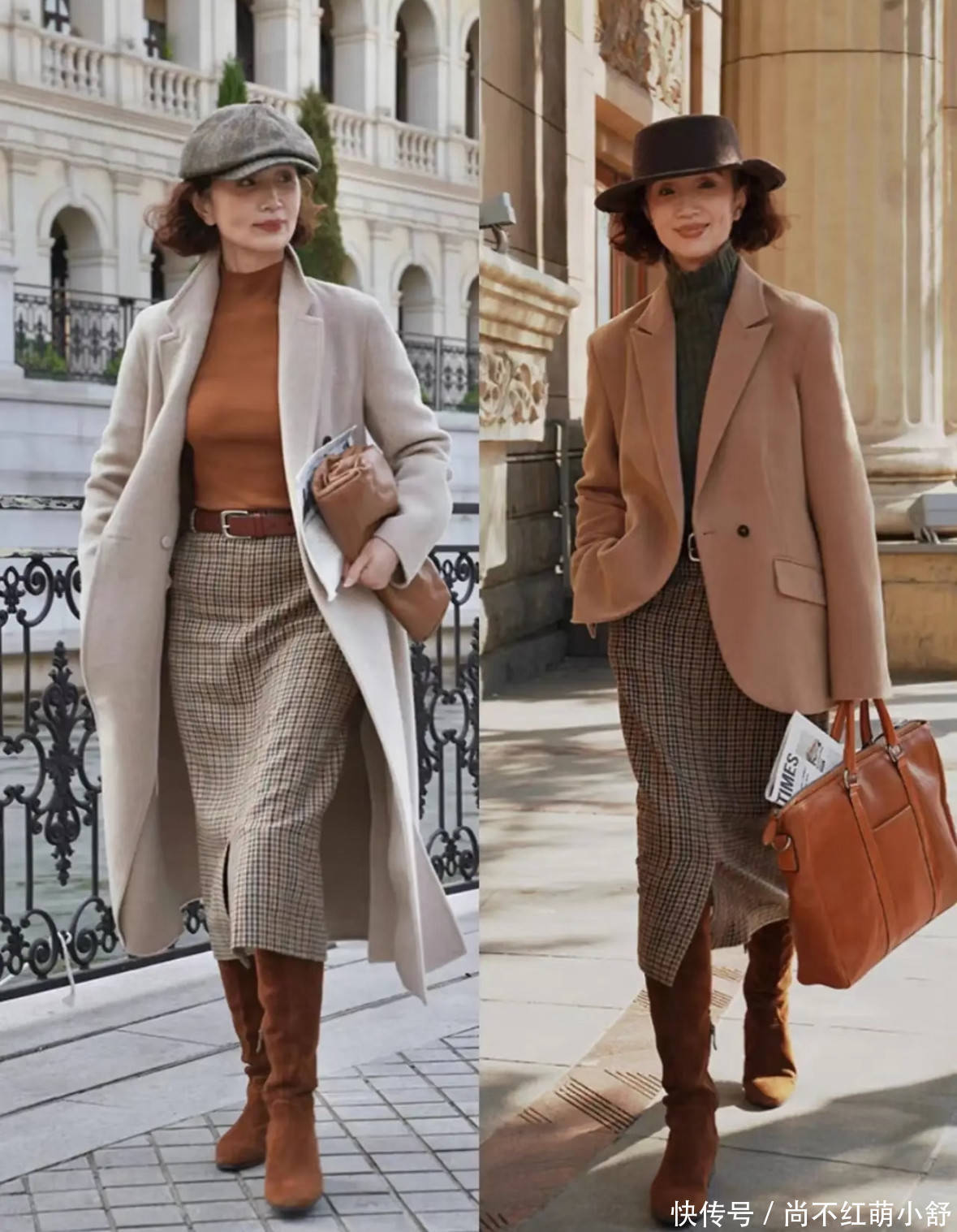高等感示范:一件棕色生意 + 格子半身裙 + 淡色大衣。将视觉焦点锁定在上半身的高质感毛衣,下装用结拜的中性色来烘托,高等感已而拉满。
