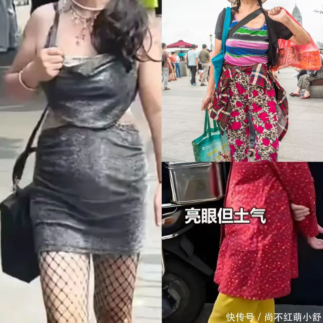 大妈感示范:大红花雪纺衫 + 绿色包臀裙 + 金色亮片鞋。颜色打破,元素散乱,看得东谈主眼花头昏。
